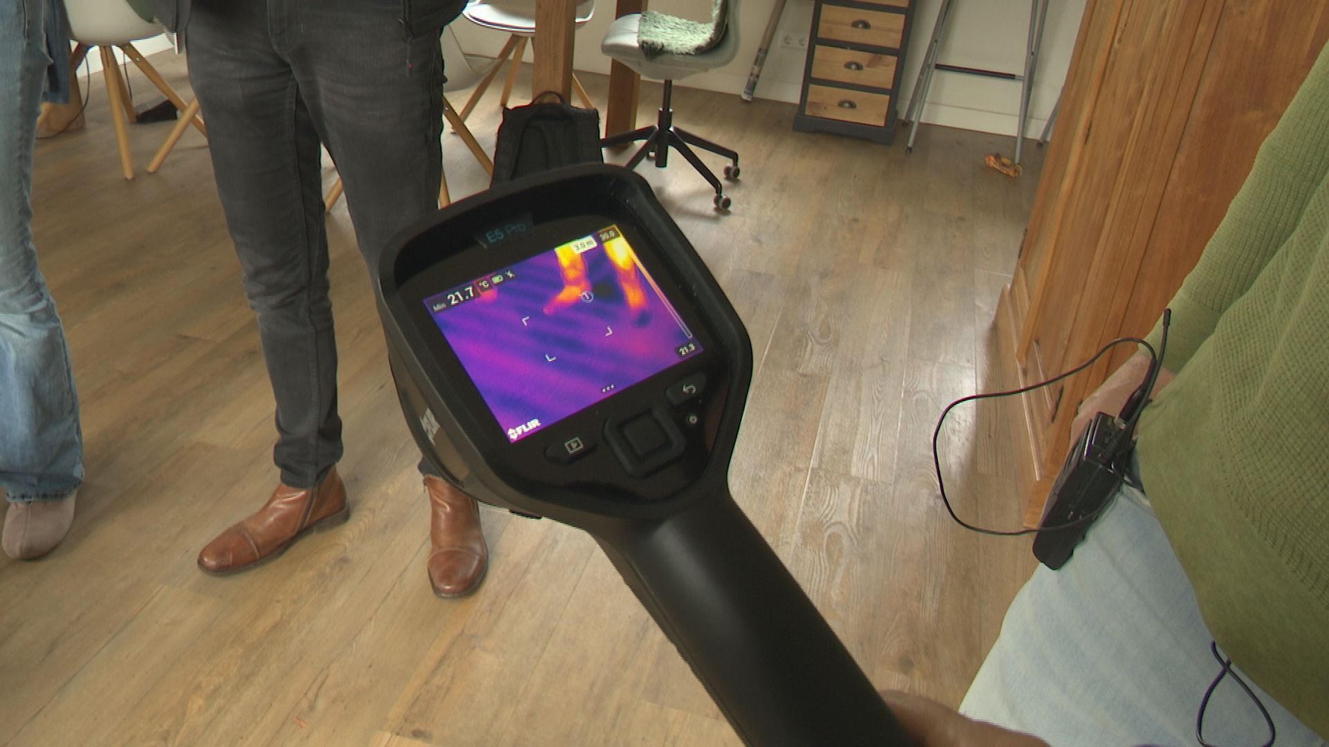 Bij een hoekwoning in Emmeloord buigt energieadviseur André Swinkels zich over de spouwmuur. "Ik ben aan het kijken of er isolatie in zit. Vier centimeter heb ik gemeten dat is als een dekentje. Acht zou nog mooier zijn", zegt hij terwijl hij zijn meetapparaat in de muur schuift.