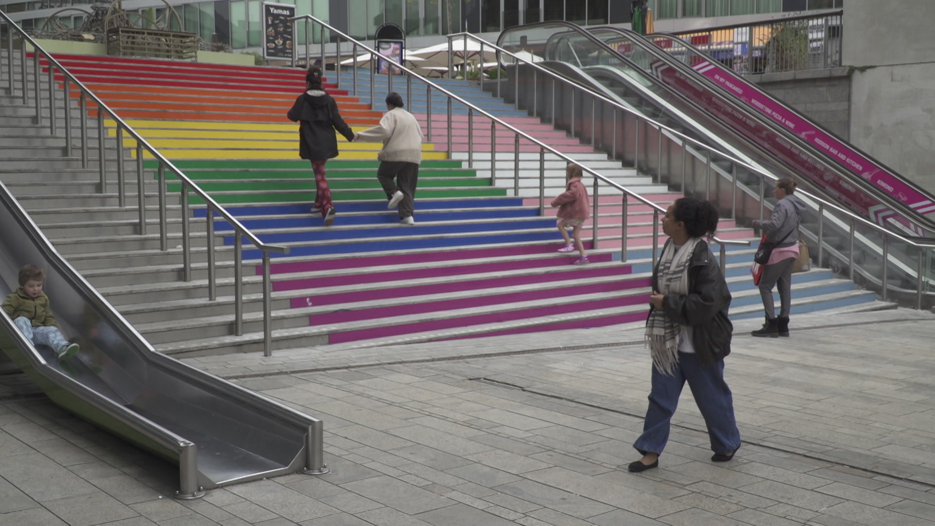 De Transgender- en Regenboogtrap in het stadshart van Almere bestaan uit twee delen en is zaterdag onthuld. De kleurrijke trap ligt bij het Belfortplein in Stad. Het symboliseert inclusie en zichtbaarheid van de transgendergemeenschap.