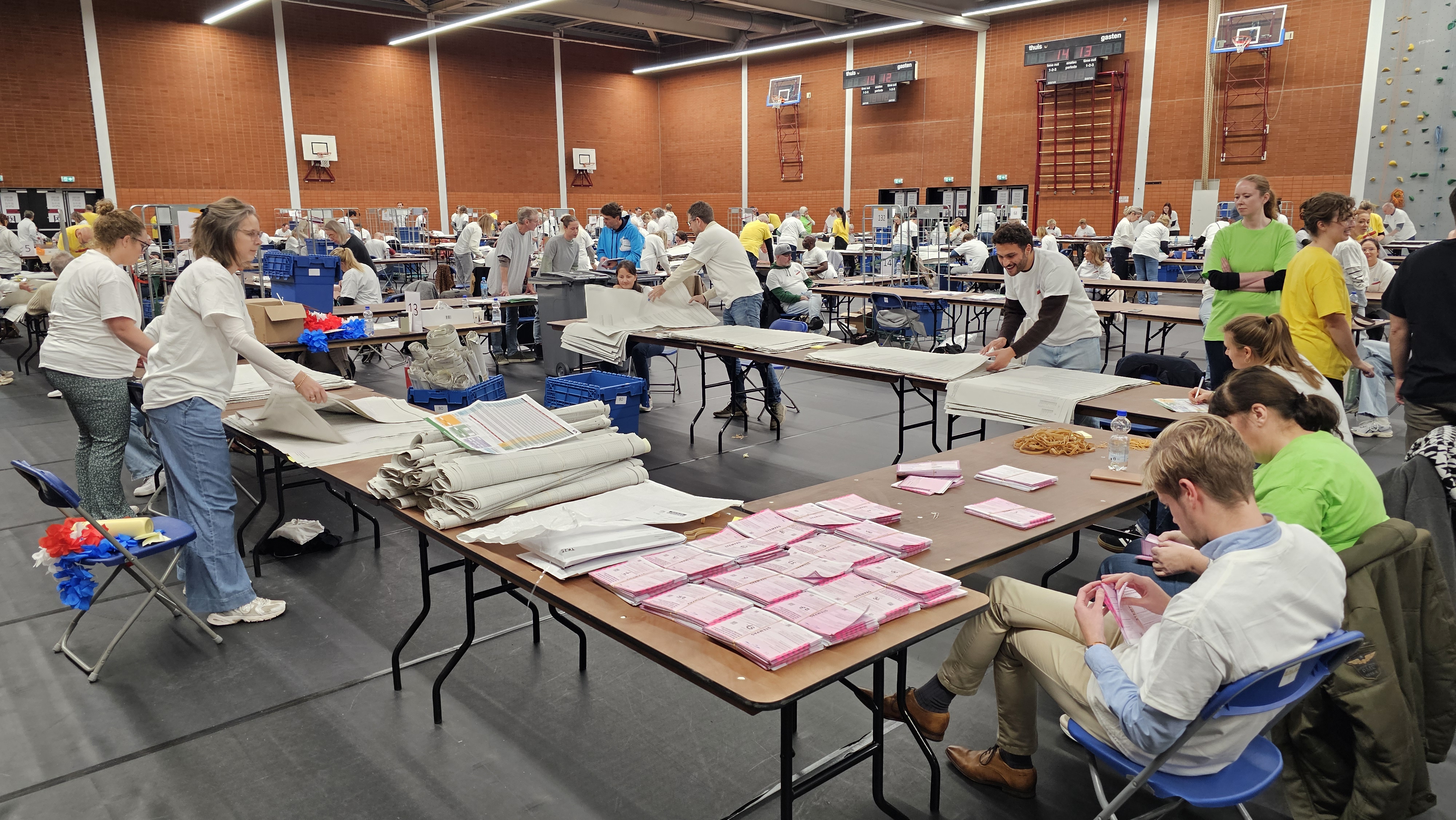 Wat opvalt is dat er nergens in de grote zaal een tablet of laptop te bekennen is. Alle resultaten worden op papier geschreven. In andere ruimtes van het sportcomplex zitten ambtenaren die deze gegevens in een computer verwerken. Donderdag ging het bij het communiceren van de verkiezingsuitslag per partij nog mis in Almere. Door een storing in het computersysteem duurde het veel langer voordat deze uitslag bekend werd.