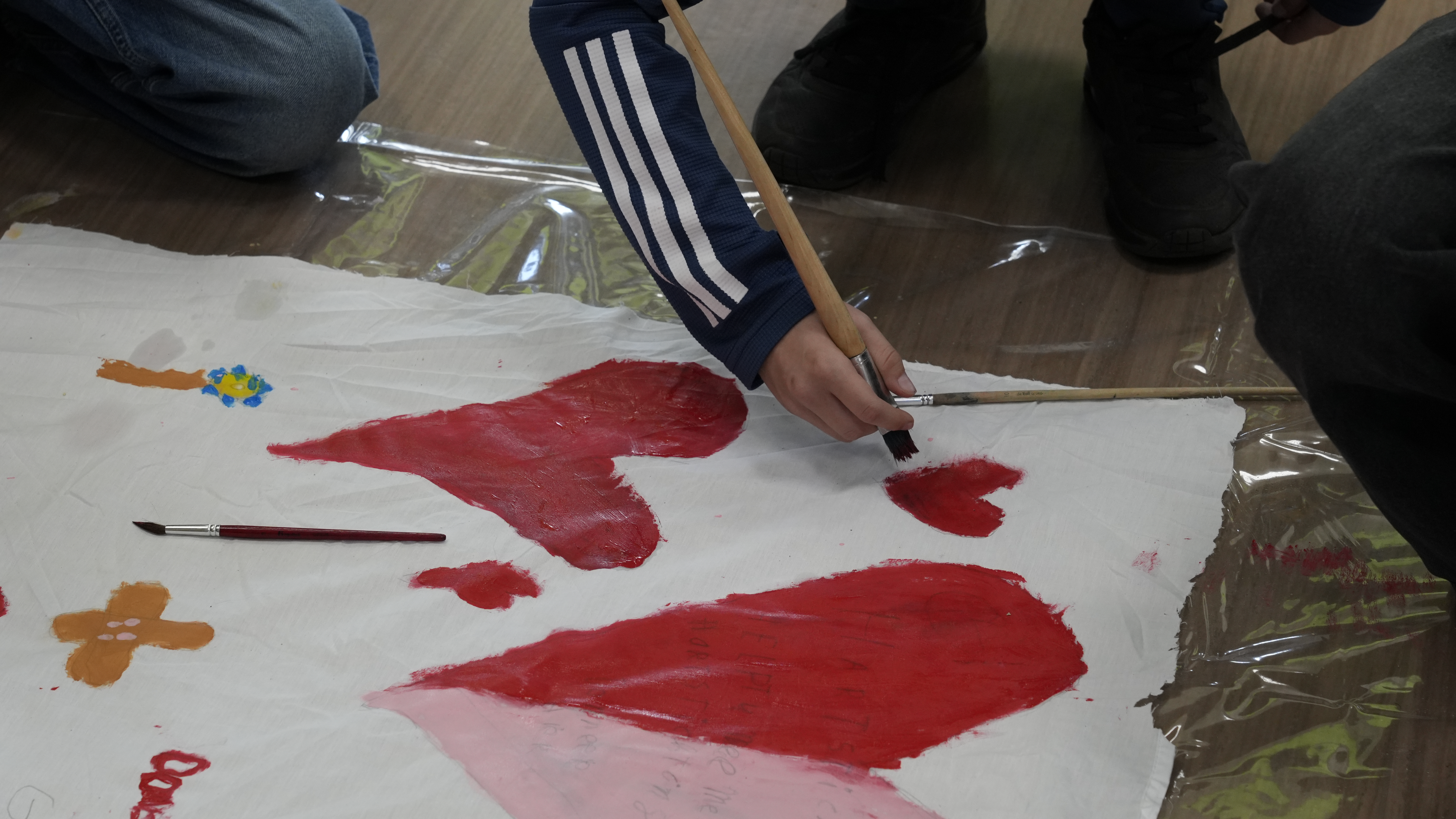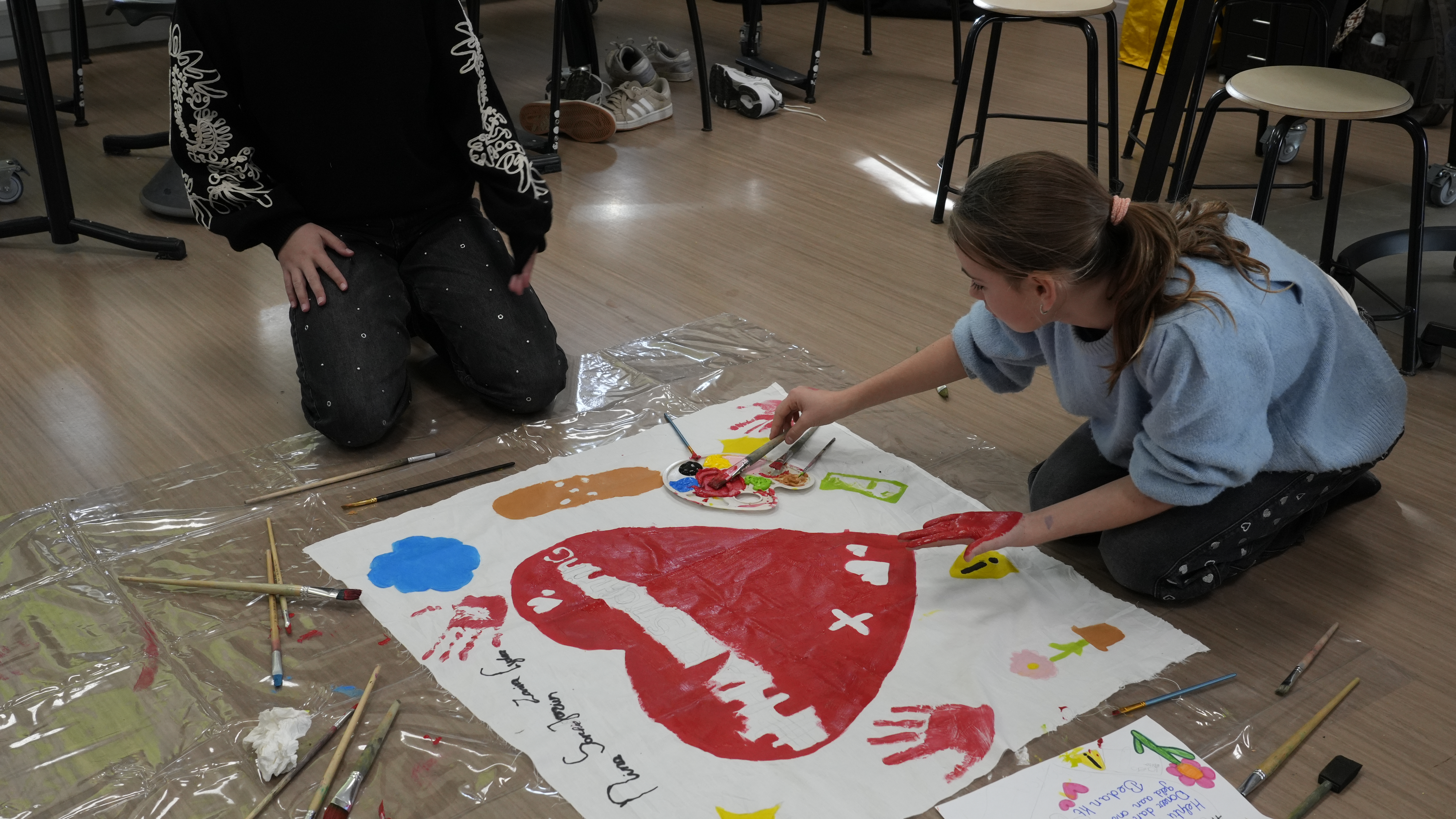 In het lokaal van groep 8 van basisschool De Ark in Espel ruikt het naar verf. Op de grond liggen spandoeken vol rode harten, slogans en glitters. De leerlingen werken hard aan hun jaarlijkse goede doelenactie voor Sint- Maarten. Waar de jongere kinderen volgende week met lampionnen langs de deuren gaan, kiest groep 8 voor iets anders: ze lopen met spandoeken om geld op te halen voor de Hartstichting.