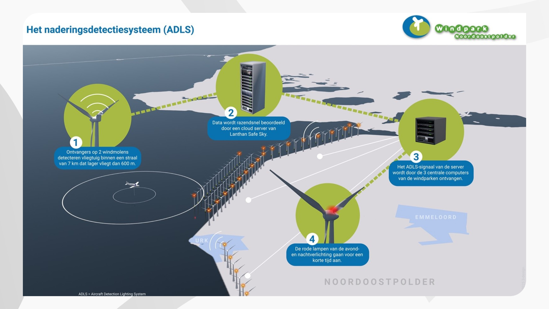 Het systeem ziet overvliegende toestellen door meetpunten op twee van de turbines. Zodra een vliegtuig of helikopter binnen een straal van zeven kilometer komt en lager vliegt dan zeshonderd meter, gaat er een signaal naar de centrale computers van het windpark. Die zetten op hun beurt binnen enkele seconden de rode lampen aan. Als een vliegtuig weer op veilige afstand zit, doven de rode lampen.