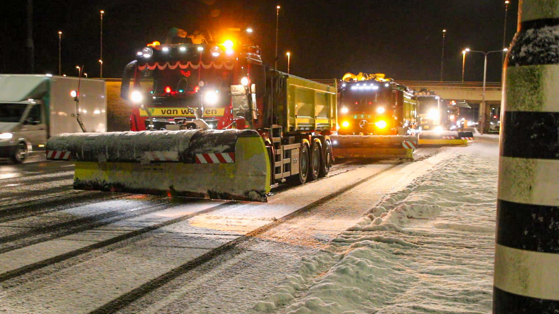 Strooiploegen van Rijkswaterstaat, de provincie en de zes Flevolandse gemeenten zijn de hele zondagavond en nacht in touw geweest om de wegen zo schoon en begaanbaar mogelijk te houden.