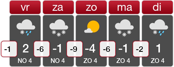 Donderdag ligt de temperatuur de hele dag net iets boven nul. Ook een groot deel van vrijdag dooit het licht, maar door een matige tot vrij krachtige oostelijke wind vriest het voor het gevoel de hele dag.