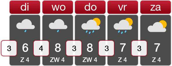 Na maandag ligt de middagtemperatuur rond de normale waarde van 6 graden. Alleen woensdag en vrijdag is het een paar graden milder.