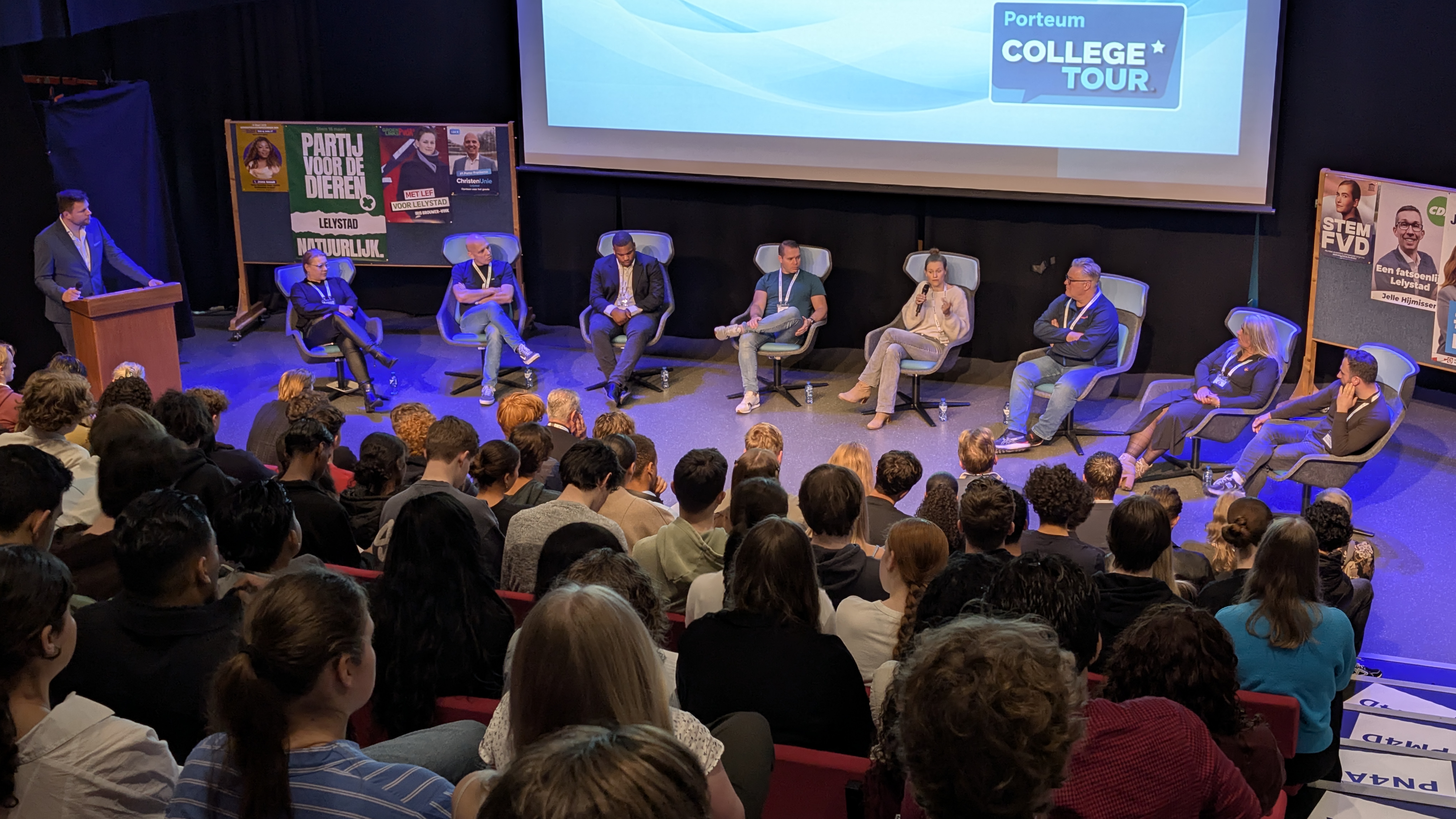 Voor veel jongeren lijkt de lokale politiek een ver-van-mijn-bedshow, maar dat bleek dinsdag allerminst het geval op scholengemeenschap Porteum in Lelystad. Zo'n vierhonderd leerlingen mochten, in de stijl van het tv-programma 'College Tour', lokale politieke partijen bevragen over de toekomstplannen voor de stad.