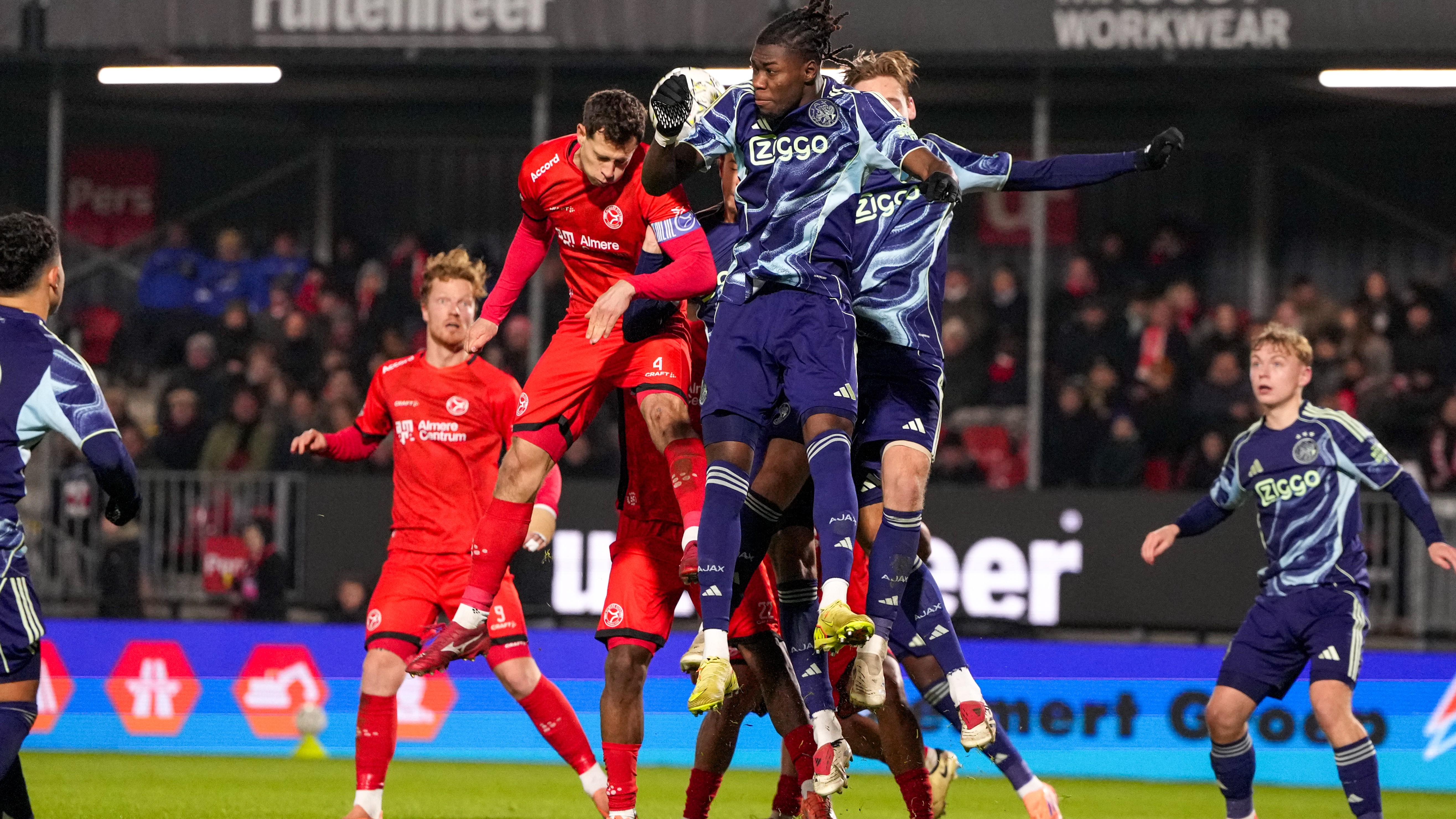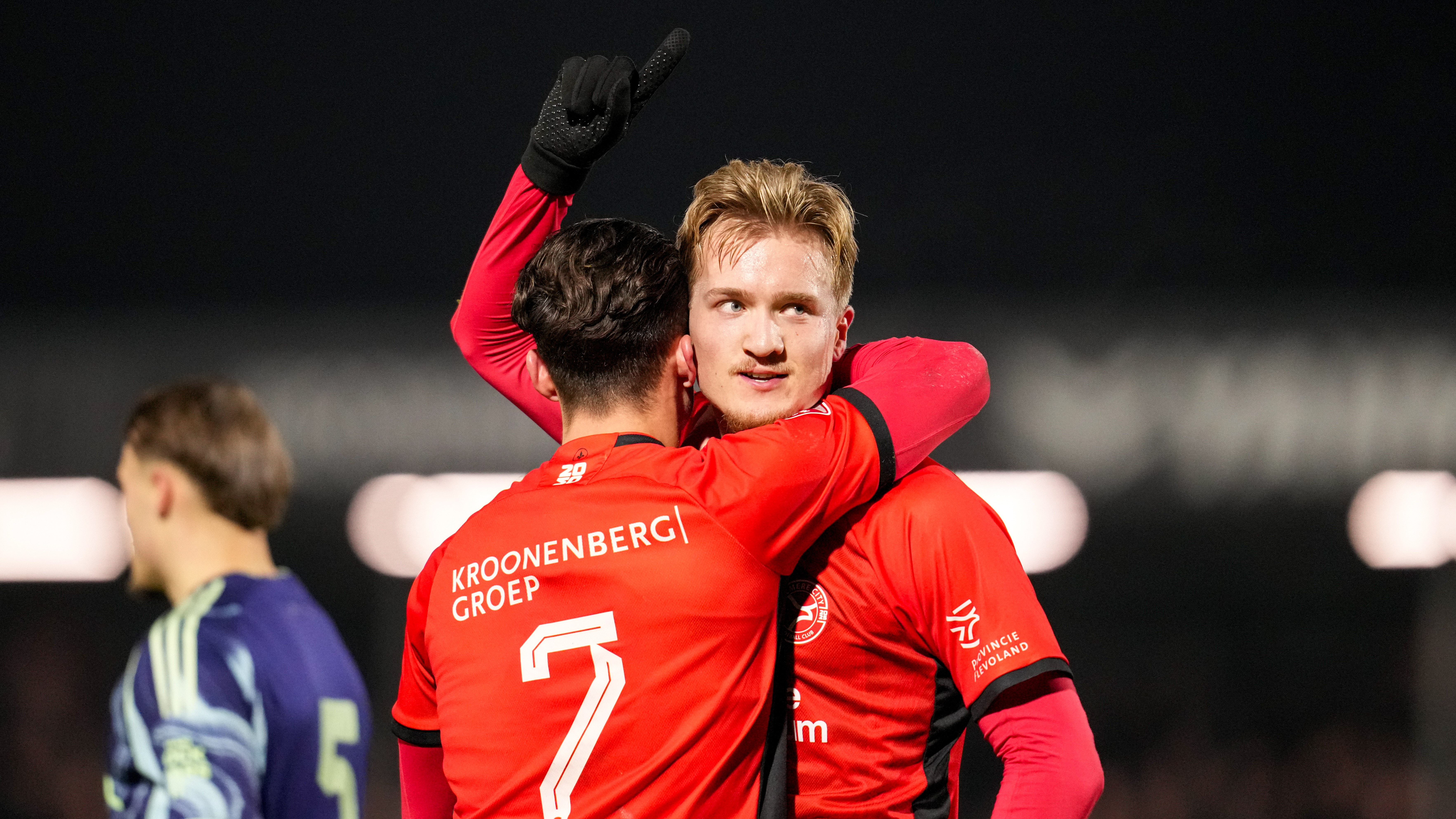 Almere City FC heeft vrijdagavond na een bizarre slotfase de thuiswedstrijd tegen Jong Ajax gewonnen. De Almeerders bogen in de extra tijd een 1-2 achterstand om in een uiteindelijke 3-2 overwinning.