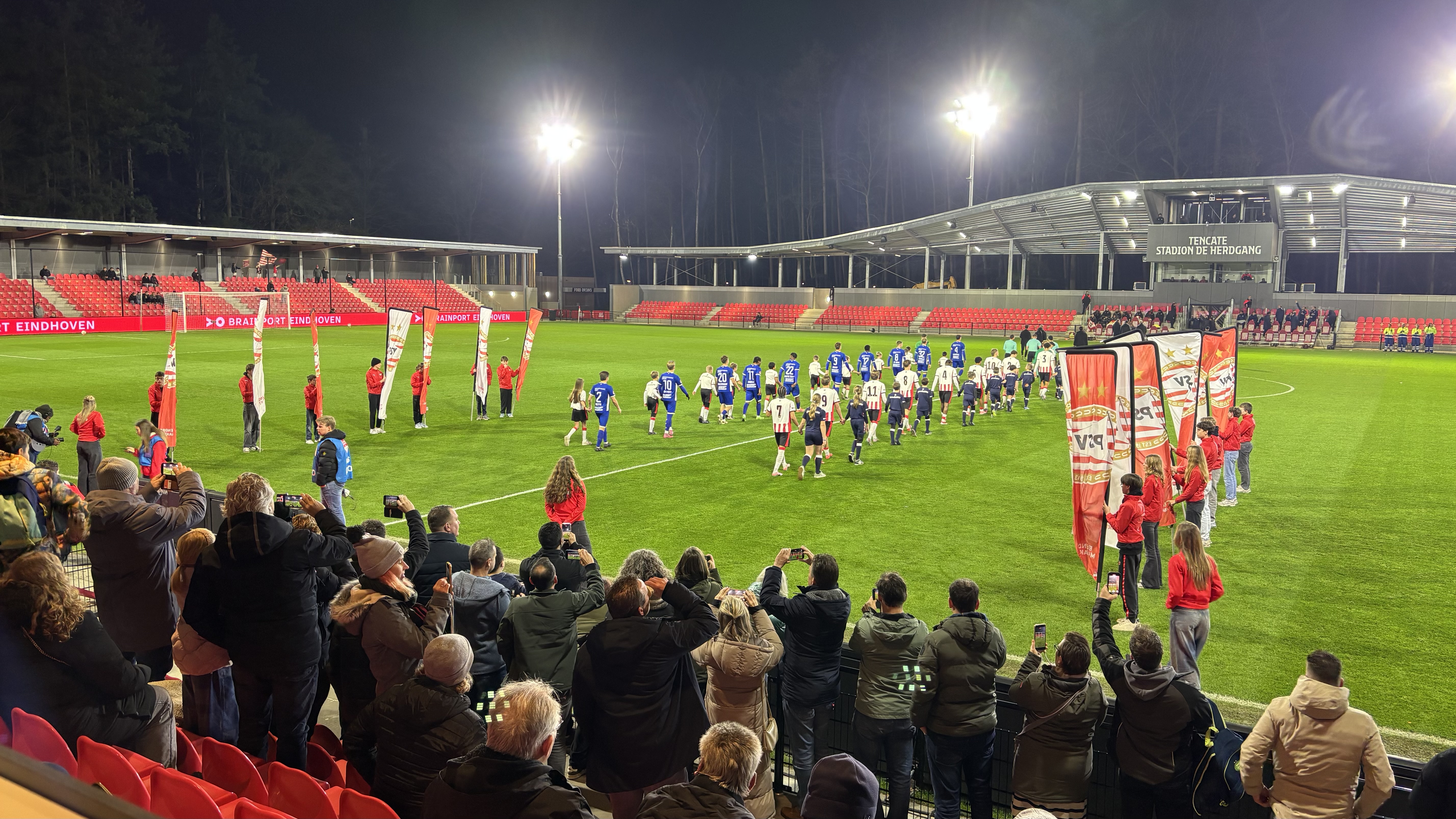 Jong PSV effectief in 1e helftJong PSV had veel balbezit in de eerste helft, maar wist aanvankelijk nauwelijks gevaarlijk te worden. Na 25 minuten voetballen was de eerste de beste kans wél direct raak voor de thuisploeg na een goal in de omschakeling. De Eindhovense talenten kwamen er razendsnel uit en Joel van de Berg mocht, geheel vrij op de rand van de zestien, de openingstreffer aantekenen.